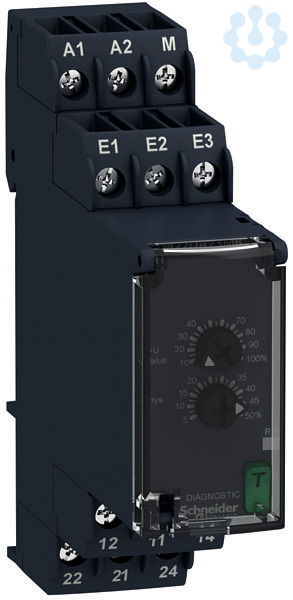 Zelio Control. Dieses Spannungsüberwachungsrelais überwacht eine Messkreis auf Überschreitung des eingestellten Grenzwertes (15-500 VAC/DC). Zur Meldung sind zwei Relaiswechsler vorhanden, die bis 8 A belastbar sind. Der Grenzwert und die Schalthysterese sind einstellbar. Die Einstellungen erfolgen über Bedienelemente in der Front, die unter einer Klarsichtabdeckung gegen Veränderungen geschützt werden können. Mit einem beleuchteten Skalenpfeil läßt sich die Einstellung der Potentiometer sehr deutlich auch aus der Entfernung erkennen. Der frontseitige Diagnoseschalter ermöglicht das Ausschalten der Ausgangsrelais zum Test der Gesamtanwendung. Mit dem Schließen der Klarsichtabdeckung wird der Diagnoseschalter automatisch zurückgesetzt. Das Weitspannungsnetzteil (24-240 VAC/DC) ermöglicht einen universellen Einsatz. Zwei LEDs zeigt den Status an. Die Baubreite beträgt 22,5 mm und die Montage erfolgt auf der Hutschiene. Der Leitungsanschluss erfolgt über Schraubklemmen.