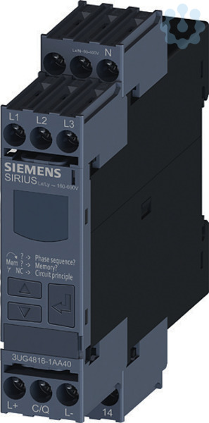 Digitales Überwachungsrelais für 3-Phasen-Spg. mit N-Leiter für IO-Link AC 50...60 Hz 3 x 160 bis 690 V Phasenfolge, Phasenausfall Phasenasymmetrie unter-und Überspannung Hysterese 1-20 V Netzstabilisierungszeit Auslöseverzögerungszeit 1 Wechsler, Schraubanschluss Digital einstellbares Netzüberwachungsrelais SIRIUS 3UG4 für die Überwachung von Phasenfolge, -ausfall und -asymmetrie sowie Unter- und Überspannung, z. B. bei instabilen Netzen oder ortsveränderlichen Anlagen wie Klimakompressoren, Kühlcontainern, Baustellenkompressoren oder Kränen.Weltweiter Einsatz durch Weitspannungsversorgung und internationale Zertifikate. Das Relais ist variabel einstellbar auf Über-, Unterschreitung oder Fensterüberwachung. Verzögerungszeiten und RESET-Verhalten sind frei parametrierbar. Weniger Platzbedarf im Schaltschrank dank einer schmalen Baubreite. Verlässliche Diagnose durch Anzeige von Istwert und Netzfehlerart. Alle Ausführungen mit abnehmbaren Anschlussklemmen.Neben Schraubanschlusstechnik stehen die Geräte auch du