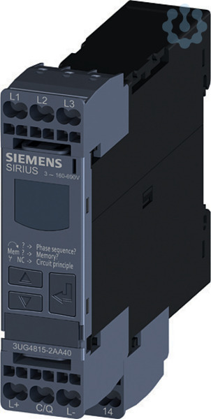 Digitales Überwachungsrelais für 3-phasige Netzspannung für IO-Link AC 50...60 Hz 3 x 160 bis 690 V Phasenfolge, Phasenausfall Phasenasymmetrie unter-und Überspannung Hysterese 1-20 V Netzstabilisierungszeit Auslöseverzögerungszeit 1 Wechsler, Federzugtechnik Digital einstellbares Netzüberwachungsrelais SIRIUS 3UG4 für die Überwachung von Phasenfolge, -ausfall und -asymmetrie sowie Unter- und Überspannung, z. B. bei instabilen Netzen oder ortsveränderlichen Anlagen wie Klimakompressoren, Kühlcontainern, Baustellenkompressoren oder Kränen.Weltweiter Einsatz durch Weitspannungsversorgung und internationale Zertifikate. Das Relais ist variabel einstellbar auf Über-, Unterschreitung oder Fensterüberwachung. Verzögerungszeiten und RESET-Verhalten sind frei parametrierbar. Weniger Platzbedarf im Schaltschrank dank einer schmalen Baubreite. Verlässliche Diagnose durch Anzeige von Istwert und Netzfehlerart. Alle Ausführungen mit abnehmbaren Anschlussklemmen.Neben Schraubanschlusstechnik stehen die Geräte auch durchgä