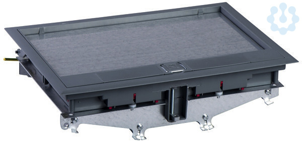 UFB700 Bodendose kunststoff 68x220x310 + Montagerahmen grau RAL7011: Halogenfreie rechteckige Bodenauslaßdose zweiteilig, geprüft nach VDE 0634 Teil 1. Die Auslaßdose ist zum Einbau in FrontLineâ-Eingießdosen vom Typ UFB-IG und in Doppelböden von 18mm ? 51mm Dicke geeignet. Es können bis zu 9 Steckdosenaulässe vom Typ CYBÔ realisiert werden. Der Deckel ist bis 3 kN belastbar und durch einfaches umstecken in vier Richtungen klappbar. Die Dose kann durch eine zusätzliche Deckelsicherung gegen unbefugten Zugriff fest verschlossen werden. Durch Kabelklammern und schaumstoffabgedichtete Klappen wird ein sauberer und sicherer Kabelauslaß gewährt.