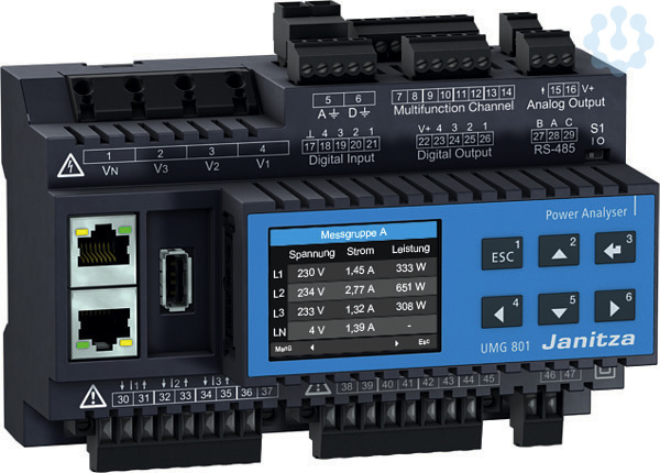 Modular erweiterbares Energiemessgerät UMG 801 zum Aufbau eines Energiemonitoring-Systems mit OPC UA SchnittstelleHutschieneneinbaugerät, 145 x 90 x 76 mm (BxHxT)Versorgungsspannung: Externe Versorgungsspannung 24-48 V DCMessung in TN-, IT und TT-NetzenMessung von Oberschwingungen bis zur 127.Messdatenspeicher (4 GB)3 SpannungsmesseingängeMesskategorie: 1000 V CAT IIIMessung in 3-Phasen 4-Leitersystemen bis 480 V/830 V (+-10%) nach IECMessung in 3-Phasen 3-Leitersystemen bis 690 V (+-10%)8 Strommesseingänge, aufgeteilt in 2 ViererblöckeMesskategorie: 300V CAT IINennstrom 5A / 1A einstellbarStrommessbereich: 5 mA... 6 AAuflösung: 0,1mA4 MultifunktionseingängeWahlweise konfigurierbar als Differenzstromeingänge, Temperatureingänge oder StrommesseingängePeripherie4x Digitale Eingänge4x Digitale Ausgänge1x Analog Ausgang2x Ethernet RJ45Zubehör (inklusiv):33.03.376 Installationsanleitung inkl. Sicherheitshinweise52.31.205 Busverbinder Basisgerät (bereits aufgesteckt)10.01.953 EndwinkelProgrammiersoftware ? GridVis