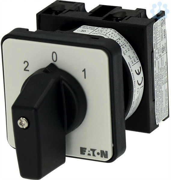 Umschalter, Sortiment: Steuerschalter, Typkenner: T0, mit schwarzem Knebel und Frontschild, Kontakte: 2, Schutzart: Front IP65, Bauform: Einbau, Schaltwinkel: 45 °, Schaltverhalten: rastend, mit 0-Stellung, Frontschild: 2-0-1, Bemessungsbetriebsleistung AC-23A, 50 - 60 Hz 400 V: P = 5.5 kW, Bemessungsdauerstrom: Iu = 20 A, 1 Baueinheit(en), Normen und Bestimmungen: IEC/EN 60947, VDE 0660, IEC/EN 60204, CSA, UL, Lasttrennschalter nach IEC/EN 60947-3