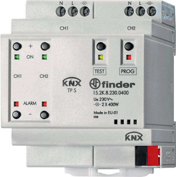 Universal-Dimmer für KNX-Bus, Eingangsspannung: 30 V DC, 2 Ausgänge, je 400 W, 230 V AC, Halogenlampen 400 W, LED-Lampen 100 W, Elektronische Transformatoren 100 W, Phasenanschnitt-/Phasenabschnitt-Dimmverfahren über ETS wählbar, für Tragschiene 35 mm (EN 60715), Breite 70 mm