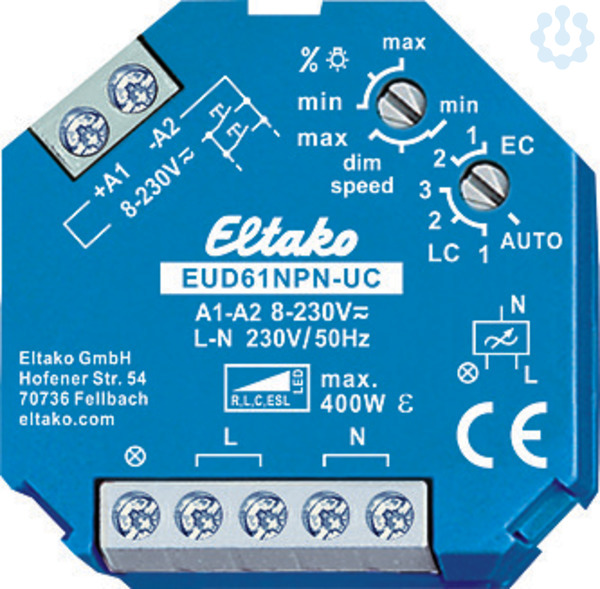 Universal-Dimmschalter. Power MOSFET bis 400W. Automatische Lampenerkennung. Stand-by-Verlust nur 0,1 Watt. Mindesthelligkeit oder Dimmgeschwindigkeit einstellbar. Mit Kinderzimmer- und Schlummerschaltung. Für Einbaumontage. 45mm lang, 45mm breit, 18mm tief. Universal-Dimmschalter für Lampen bis 400W, abhängig von den Lüftungsverhältnissen. Dimmbare Energiesparlampen ESL und dimmbare 230V-LED-Lampen zusätzlich abhängig von der Lampenelektronik. Schaltung im Nulldurchgang mit Soft-Ein und Soft-Aus zur Lampenschonung. Universal-Steuerspannung 8..230V UC, galvanisch getrennt von der Versorgungs- und Schaltspannung 230V. Keine Mindestlast erforderlich. Kurze Steuerbefehle schalten ein/aus, permanente Ansteuerung verändert die Helligkeit bis zu dem maximalen Wert. Eine Unterbrechung der Ansteuerung ändert die Dimmrichtung. Die eingestellte Helligkeitsstufe bleibt beim Ausschalten gespeichert (Memory). Bei einem Stromausfall werden die Schaltstellung und die Helligkeitsstufe gespeichert und wird gegebenenfalls bei