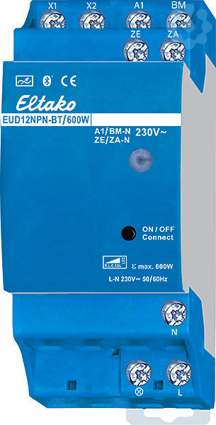 Universal-Dimmschalter mit integrierter Schaltuhr, Bluetooth und ELTAKO Connect-App. Power MOSFET bis 300?W. Automatische Lampenerkennung. Stand-by-Verlust nur 0,3 Watt. Mindesthelligkeit, Maximalhelligkeit, Dimmgeschwindigkeit, Kinderzimmerschaltung, Schlummerschaltung, Bewegungsmelder, Ein, Aus, TI, ER, ESV, TLZ, MIN, MMX, Programme mit Zeit- oder Astrofunktion, Zeitversatz Sonnenwende, Datum und Uhrzeit, Standort und Bluetooth können gemäß der Bedienungsanleitung, über die App eingestellt werden. Reihenbaugerät für Montage auf Tragschiene DIN-EN-60715 TH35. 1 Teilungseinheit = 18?mm breit, 58?mm tief. Universal-Dimmschalter für Lampen bis 300?W, abhängig von den Lüftungsverhältnissen. Dimmbare 230?V-LED-Lampen und dimmbare Energiesparlampen zusätzlich abhängig von der Lampenelektronik und der Dimmart siehe Technische Daten Seite 9-22. Schaltung im Nulldurchgang mit Soft-Ein und Soft-Aus zur Lampenschonung. Steuer-, Versorgungs- und Schaltspannung 230?V. Die integrierte Schaltuhr hat bis zu 10 Programm-Sp