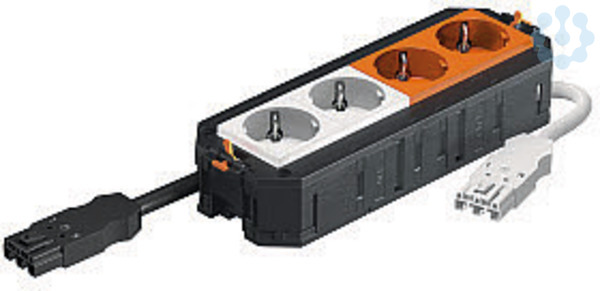 Der anschlussfertige Universalträger UTC4 verfügt über 2 vorinstallierte 33°-Schutzkontaktsteckdosen in weiß und über 2 vorinstallierte 33°-Schutzkontaktsteckdosen in orange, 250 V~ 16 A. Passend zu den Verbindungsleitungen VL und den Geräteeinbaueinheiten der Nenngröße R7, R9 und 9. PVC-Anschlussleitung mit Stecker, 3-polig, Typ WINSTA MIDI.