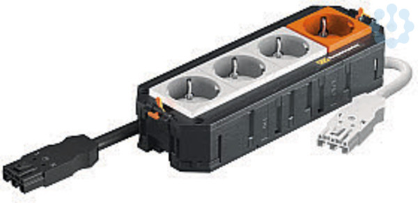 Der anschlussfertige Universalträger UTC4 verfügt über 3 vorinstallierte 33°-Schutzkontaktsteckdosen in weiß und eine vorinstallierte 33°-Schutzkontaktsteckdose in orange (mit Überspannungsschutzmodul Typ 3 nach DIN EN 61643-11), 250 V~ 16 A. Passend zu den Verbindungsleitungen VL und den Geräteeinbaueinheiten der Nenngröße R7, R9 und 9. PVC-Anschlussleitung mit Stecker, 3-polig, Typ WINSTA MIDI.