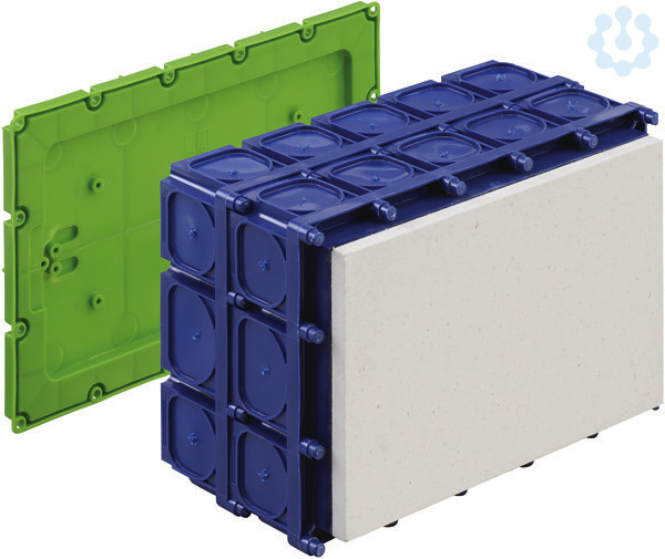 Einbaukasten für Betoneinbau, vorbereitet für Aufnahme der WK-Klemmen 2,5-25qmm, geeignet zur Aufnahme einer 40-poligen Telefon-Anschlussleiste, als Telefon-Durchgangskasten nach DIN 47614-615, oder als IBT-Verteilung UP 015 (1-reihig, 15 TE), halogenfrei, zum Einbau von NV/HV/LED-Leuchten und Lautsprechern, Auslassöffnung Fermacell(R)-Platte (Tragfähigkeit max. 10 kg), variabel bis max. 220 x 150mm, maximale Einbauhöhe NV-Leuchten: 130mm, HV-Leuchten: 135mm, elektronische Trafos bis max. 150 VA, Lampenleistung max. 50W / LED 40W