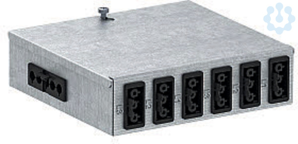 Energieverteiler für Starkstromtechnik mit Steckanschluss, bestückt und vorverdrahtet. Eingang: 1x Dreiphasen-Stromkreis über einen selbstverriegelnden Steckverbinder 5-polig, Typ GST18i (Steckerteil). Ausgang: 6 selbstverriegelnde Steckverbinder 3-polig in schwarz, 16 A, Typ GST18i (Buchsenteil: 2 x L1, 2 x L2, 2 x L3). Verdrahtung intern: PVC-Aderleitung H07V-U2,5.