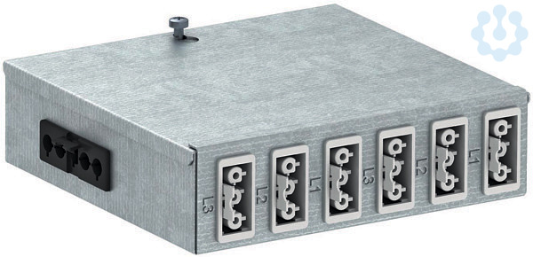 Energieverteiler für Starkstromtechnik mit Steckanschluss, bestückt und vorverdrahtet. Eingang: 1x Dreiphasen-Stromkreis über einen selbstverriegelnden Steckverbinder 5-polig, Typ GST18i (Steckerteil). Ausgang: 6 selbstverriegelnde Steckverbinder 3-polig in weiß, 16 A, Typ GST18i (Buchsenteil: 2 x L1, 2 x L2, 2 x L3). Verdrahtung intern: PVC-Aderleitung H07V-U2,5.