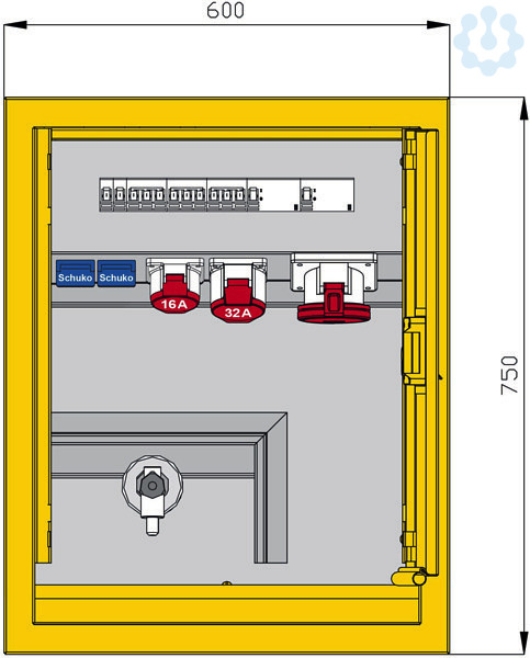 WALTHER Unterputzverteiler aus Edelstahl Gehäuse aus Edelstahl gebürstet (Werkstoff 1.4301) ohne Lackierung Tür mit Kunststoffkastenschloss mit Profilhalbzylinder, Schließung G2123 Kabelausführung bei geschlossener Tür möglich mit Profilgummidichtung Kabelzuleitung durch Reduzierringe 12-48 mm 3 x von oben / 2 x von unten Schutzart IP 44 Größe ca.: Blendrahmen: 750 x 600mm / H-B UP-Gehäuse: 675 x 528 x 277mm / H-B-T Anschluss: 1 Reihenklemme 2 x 5 x 25qmm für Zuleitung und Kabelschleife Abgang / Absicherung: 1 RCD-Schutzschalter 4P 63A/30mA -A- 1 CEE-Anbaudose 63A 5P 400V 6h mit Leitungsschutzschalter (MCB) 3P 63A -C- 1 RCD-Schutzschalter 4P 63A/30mA -A- 1 CEE-Anbaudose 32A 5P 400V 6h mit Leitungsschutzschalter (MCB) 3P 32A -C- 1 CEE-Anbaudose 16A 5P 400V 6h mit Leitungsschutzschalter (MCB) 3P 16A -C- 2 Schutzkontaktsteckdosen 16A 2P 230V mit je 1 Leitungsschutzschalter (MCB) 1P 16A -B- 1 Wasserzapfstelle -frostsicher-