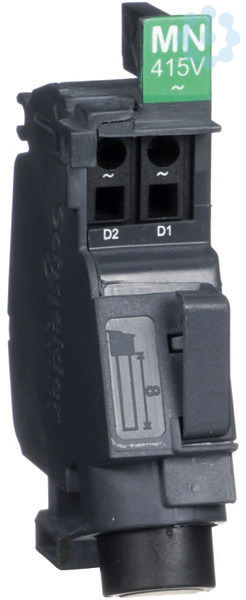 Compact NSXm und PowerPact B. Zubehör für Komplettgeräte bis 160 A. Unterspannungsauslöser MN 380-415V AC 50Hz für NSXm/Powerpact B. Die Baureihe basiert auf der Technologie der roto-aktiven Kontaktunterbrechung. Mit integriertem thermo-magnetischem Auslösegerät. Einbau auf DIN-Schiene oder Montageplatte. Zusatzausrüstung von außen sichtbar. Integrierter Differenzstromschutz (VIGI) mit Micrologic 4. Der Compact NSXm verfügt mit EverLink über eine neue patentierte Anschlusstechnik zur Kompensation der Kriechbewegungen der Kabel. Mit der EverLink-Anschlusstechnik sparen Sie Platz und Zeit bei der Montage des Schaltfelds. Die blanken Kabelanschlüsse sind so sicher wie Kabelanschlüsse mit Presskabelschuh.