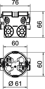 Unterputz-GerätedosemitluftdichtenMembraneinführungen,fürdenEinsatzinMauerwerkmiteinerEinbautiefevonmindestens66mm. 4x3Schraubdome BeidseitigkoppelbarerVerbindungsstutzenmitBajonettverschluss 4Kombi-RohreinführungenbisØ20und25mm 2EinführungenbisØ20mm 2EinführungenbisØ12mm 4EinführungenbisØ12mmimBodenGemäßIEC60670-1,IEC60670-22undDIN49073-1.
