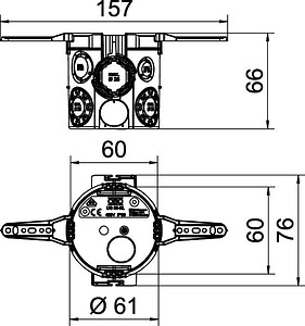 Unterputz-GerätedosemitNagellaschen,fürdenEinsatzinMauerwerkmiteinerEinbautiefevonmindestens66mm. 4x3Schraubdome BeidseitigkoppelbarerVerbindungsstutzenmitBajonettverschluss 6Kombi-RohreinführungenbisØ20und25mm 2EinführungenbisØ20mm 2EinführungenbisØ14mm 1EinführungbisØ20mmimBodenGemäßIEC60670-1,IEC60670-22undDIN49073-1.