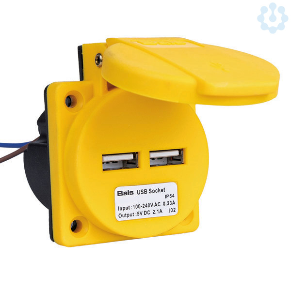 USB Ladesteckdose als Anbausteckdose IP54, primär: 0,23A / 100-240V AC, sekundär: 2,1A / 5V DC, Ausgang: 2x USB Typ A