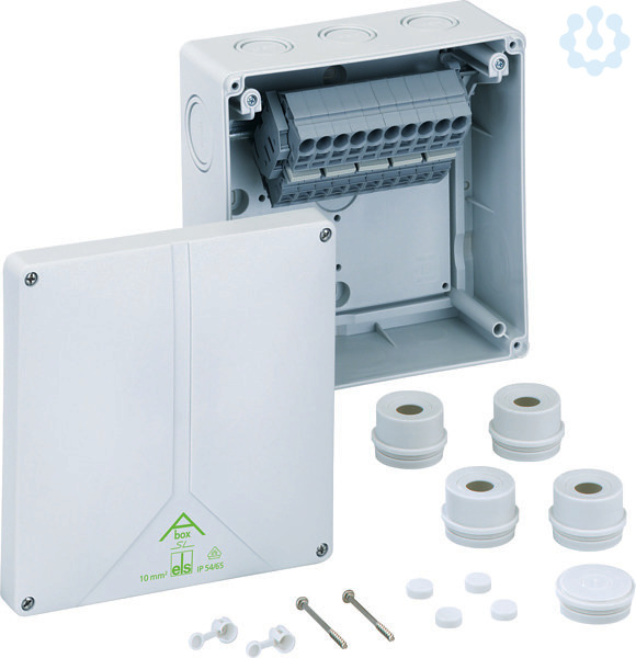 Verbindungsdose nach DIN EN 60670 (VDE 0606), Ui=690V, mit IP54 Anbaustutzen, M40, Dichtbereich 17-30mm, mit Verschlussstopfen M40, mit Plombierset, grau, mit hochliegender schraubenloser Klemme 5-polig, max. Nennquerschnitt nach DIN EN 60998: 10qmm, bei einer Strombelastbarkeit von 57 A, klemmbare Querschnitte pro Pol:, 4 x 0,5 bis 16qmm starr und flexibel