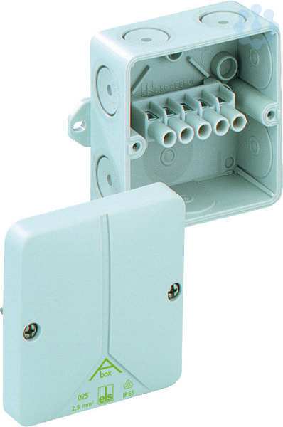 Verbindungsdose nach DIN EN 60670 (VDE 0606), Ui=690V, mit selbstdichtenden, weichen Einführungsmembranen, M20, Dichtbereich 2-16mm, mit Außenbefestigungslaschen, grau, mit Schraubklemme, 5-polig-2,5/4qmm (4 x 1,5q / 4 x 2,5q / 3 x 4q)