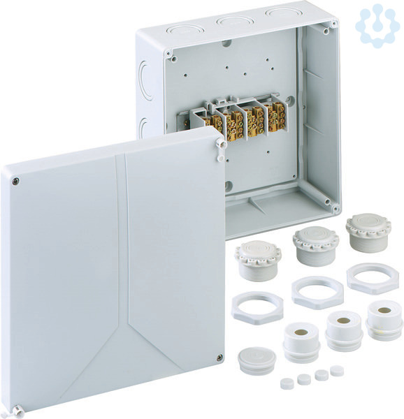 Verbindungsdose nach DIN EN 60670 (VDE 0606), mit Hauptleitungsabzweigklemme, 25qmm, mit IP54 Anbaustutzen, mit Verschlussstopfen M40, mit Würgenippel M50, Schraubklemme 4-polig 25qmm, Zugang je Pol 2 x 25qmm, Abgang je Pol 4 x 16qmm, mit Plombierset, grau, Schraubklemme 4-polig-25qmm
