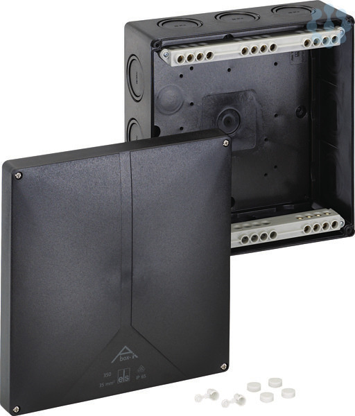 Verbindungsdose, Industrie Qualität nach DIN EN 60670 (VDE 0606), Ui=690V, witterungsbeständig, schlagfest, halogenfrei, mit Plombierset, passende Kabeleinführungen siehe Zubehör, schwarz, mit hochliegenden Schraubklemmen, 5-polig-35qmm (4 x 10q / 4 x 16q / 4 x 25q / 4 x 35q)