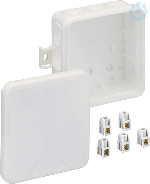 Verbindungsdose nach DIN EN 60670 (VDE 0606), 12 Einführungen, 3 Bodeneinführungen, komplett mit Lochwerkzeug und Verschlussstopfen, mit außenliegenden Befestigungsstellen, weiß, mit 5 aneinanderreihbaren Schraubklemmen 2,5qmm