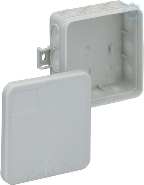 Verbindungsdose nach DIN EN 60670 (VDE 0606), 12 Einführungen, 3 Bodeneinführungen, komplett mit Lochwerkzeug und Verschlussstopfen, mit außenliegenden Befestigungsstellen, grau, ohne Klemmen, für VDE-zugel. Einzelklemmen