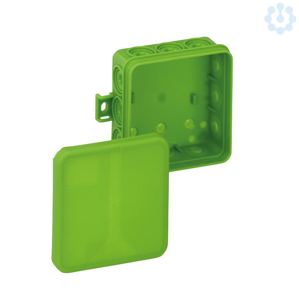 Verbindungsdose nach DIN EN 60670 (VDE 0606), 12 Einführungen, 3 Bodeneinführungen, komplett mit Lochwerkzeug und Verschlussstopfen, mit außenliegenden Befestigungsstellen, grün, ohne Klemmen, für VDE-zugel. Einzelklemmen, zur Kennzeichnung von Stromkreisen der Ersatzstromversorgung