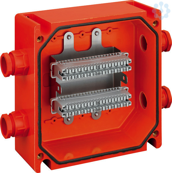 Kabelabzweig- und Verbindungskasten mit zeitsparender (löt-, schraub- und abisolierfreier) Anschlusstechnik für Kabel mit Funktionserhalt nach DIN 4102 Teil 12-geprüft durch die MPA Dresden, Verbindungskasten bestückt mit zwei LSA-Plus-Anschlussleisten, jeweils für 10 Doppeladern (2 x 10 DA), die LSA-Plus-Kontakte sind für Massivleiter mit 0,4-0,8mm Durchmesser und einem Isolierungsaußendurchmesser von 0,7 -1,6mm geeignet.