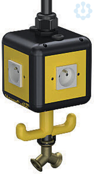 Gehäuse mit 1 m Rohr 1/2? mit Anschluss für Druckluftschlauch 13 x 3,5 mm und 2-Wege-Verteiler 1/2?. Gehäuse mit Aufhängeöse und Griffhaken und mit 4 Abdeckplatten. Bestückt wie folgt: 2 x Klemmen 3-polig, 4 x 1fach Steckdosen mit Erdungsstift 16 A/250 V mit erhöhtem Berührungsschutz, auf zwei Wechselstromkreise vorverdrahtet.