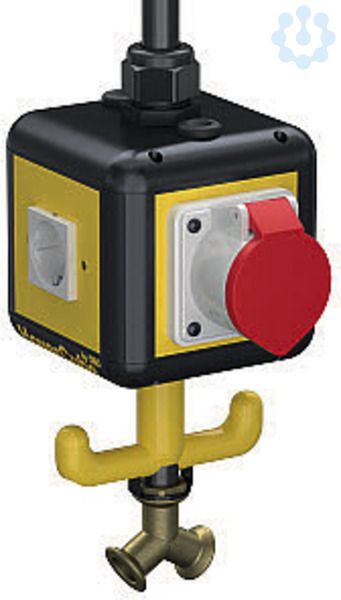 Gehäuse mit 1 m Rohr 1/2? mit Anschluss für Druckluftschlauch 13 x 3,5 mm und 2-Wege-Verteiler 1/2?. Gehäuse mit Aufhängeöse und Griffhaken und mit 4 Abdeckplatten. Bestückt wie folgt: 1 x Klemmen 3-polig, 3 x 1fach Schutzkontaktsteckdosen 16 A/250 V mit erhöhtem Berührungsschutz, auf einen Wechselstromkreis vorverdrahtet. 1 x CEE-Steckdose 16 A/415 V.