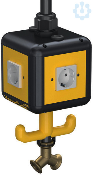 Gehäuse mit 1 m Rohr 1/2? mit Anschluss für Druckluftschlauch 13 x 3,5 mm und 2-Wege-Verteiler 1/2?. Gehäuse mit Aufhängeöse und Griffhaken und mit 4 Abdeckplatten. Bestückt wie folgt: 2 x Klemmen 3-polig, 4 x 1fach Schutzkontaktsteckdosen 16 A/250 V mit erhöhtem Berührungsschutz, auf zwei Wechselstromkreise vorverdrahtet.