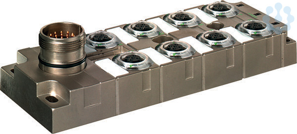Verteiler 8xM12. 5-pol. Steck. M23 19-p. Abgang frontseitig Diagn./I Überw. 0,5A