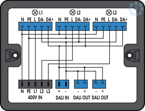 Verteilerbox. 400 V + DALI. 2 Eingänge. 5 Ausgänge. Kod. A, I. MINI, MIDI. schwarz