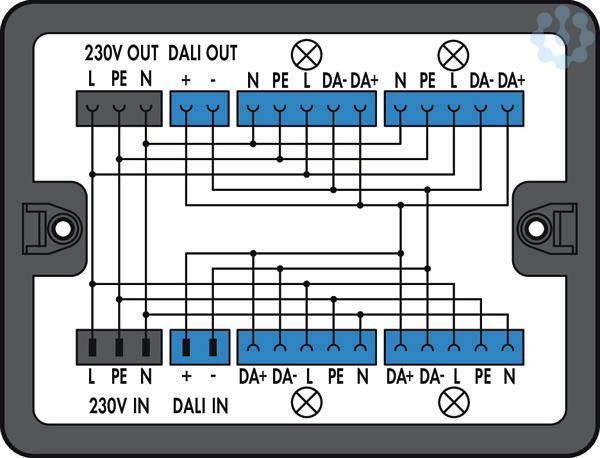 Verteilerbox. 230 V + DALI. 2 Eingänge. 6 Ausgänge. Kod. A, I. MINI, MIDI. schwarz
