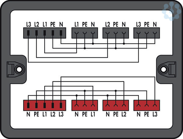 Verteilerbox. Dreh- auf Wechselstrom (400 V/230 V). 2 Eingänge. 6 Ausgänge. Kod. A, P. MIDI. schwarz