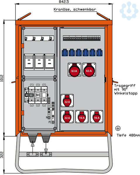 Einbauten bis einschließlich RCD-Schutzschalter im Isolierstoffgehäuse Schutzart: IP 44 Größe ca.: 1012 x 843 x 480mm / H-B-T
