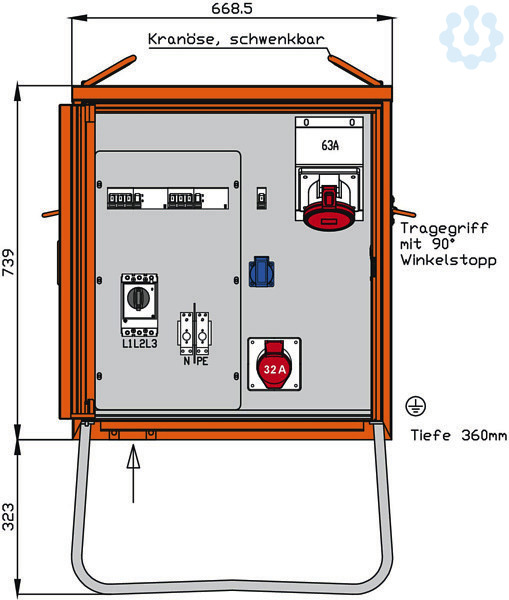 Einbauten bis einschließlich RCD-Schutzschalter im Isolierstoffgehäuse Schutzart: IP 44 Größe ca.: 739 x 669 x 360mm / H-B-T + Untergestell-Höhe ca.: 323mm