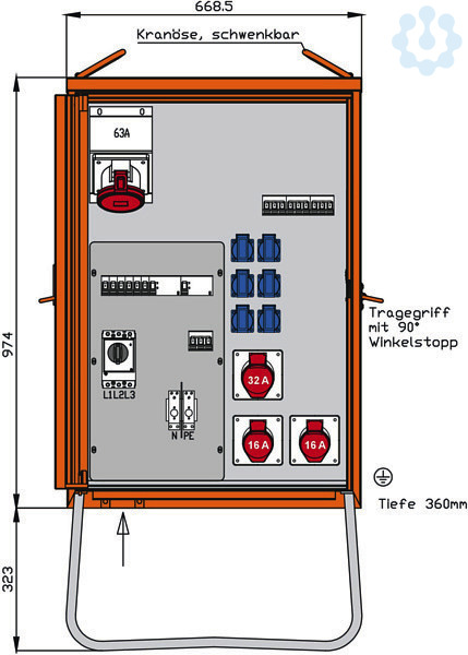 Einbauten bis einschließlich RCD-Schutzschalter im Isolierstoffgehäuse Schutzart: IP 44 Größe ca.: 974 x 669 x 360mm / H-B-T + Untergestell-Höhe ca.: 323mm