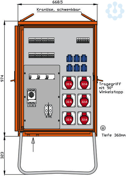 Einbauten bis einschließlich RCD-Schutzschalter im Isolierstoffgehäuse Schutzart: IP 44 Größe ca.: 974 x 669 x 360mm / H-B-T + Untergestell-Höhe ca.: 323mm