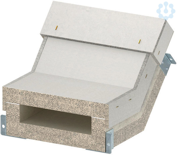 Vertikalbogen steigend für Brandschutzkanal PYROLINE® Con S, Typ BSKH09-K0521 bestehend aus wasser- und frostbeständigen Glasfaserleichtbeton zur Herstellung von vertikalen Richtungsänderungen (45°) im Kanalverlauf. Fertig montierte Verbindungsbeschläge sorgen für eine schnelle Montage vor Ort, lose aufgelegte Deckel für eine schnelle Revision und Nachbelegung.