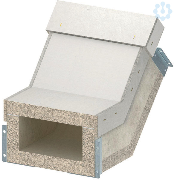 Vertikalbogen steigend für Brandschutzkanal PYROLINE® Con S, Typ BSKH09-K1021 bestehend aus wasser- und frostbeständigen Glasfaserleichtbeton zur Herstellung von vertikalen Richtungsänderungen (45°) im Kanalverlauf. Fertig montierte Verbindungsbeschläge sorgen für eine schnelle Montage vor Ort, lose aufgelegte Deckel für eine schnelle Revision und Nachbelegung.
