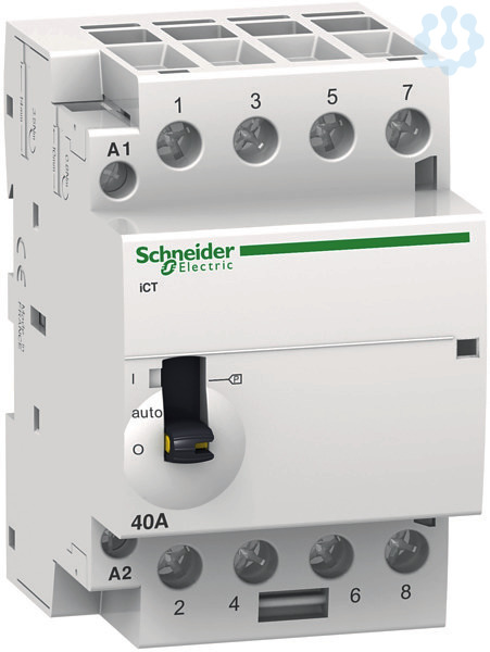 Installationsschütz Acti 9 iCT. Nennstrom 40A, 4S, Steuerspannung 24V, 50Hz, MO, Isolationsspannung (Ui) 500V AC. Schalten von Stromkreisen bis 100A. Klemmen IP 20. Geräuscharmes Schalten. Mechanische Schaltstellungsanzeige. Installationsschützen mit Vorwahl verfügen über einen frontseitigen Betriebsartenwahlschalter mit vier Schaltstellungen. Kompatibel mit der gesamten Produktreihe Acti 9. Der iCT Installationsschütz erfüllt folgende Normen- EN 61095 und IEC 1095. Des Weiteren ist diese Baureihe VDE zertifiziert!.