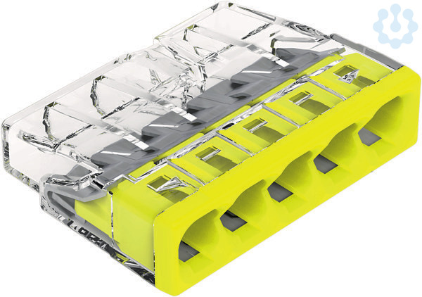 COMPACT-Verbindungsdosenklemme. für eindrähtige Leiter. max. 2,5 mm². 5 Leiter. Gehäusefarbe transparent. Deckelfarbe gelb. Umgebungstemperatur max. 60 °C (T60). 2,50 mm². transparent