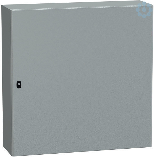 Spacial S3D Wandgehäuse aus Stahl mit Volltür. 1000 x 1000 x 1000 x 300 mm. Einteiliges Gehäuse, inklusive Montageplatte. 3-Punkt-Verschlusssystem mit Griff und 3 mm Doppelbartschliessung. Aus Stahl, Epoxid-Polyester-Pulverbeschichtung. Schutzart IP 66, IK10, Farbe RAL 7035.