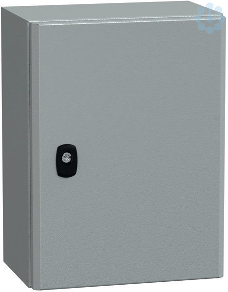 Wandschrank Spacial S3D aus Stahlblech mit Montageplatte. 400 x 300 x 200 mm. Korpus aus einem Stück gefalzt und verschweißt, verstärktes Vorderprofil in zweifacher Blechstärke als Regenrinnenprofil. Bündige Rückseite. IP66, IK10. Leicht aushängbare Tür, schneller Türanschlagwechsel, hervorragende Stabilität durch 20 mm starken Verstärkungsrahmen in doppelter Blechstärke, Türöffnung 120°, 2 oder 3 verdeckt liegende Scharniere. Dreipunktverschlusssystem mit nur einem Betätigungselement ab Bauhöhe 600 mm. Problemloser Gestängeumbau. Max. Belastbarkeit: 50 kg/m2. angefastes Türprofil, plasmaverschweißt, Beschichtung aus Epoxy-Polyester in RAL 7035.