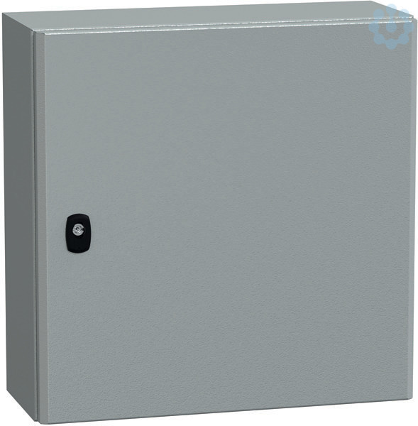 Wandschrank Spacial S3D aus Stahlblech mit Montageplatte. 500 x 500 x 200 mm. Korpus aus einem Stück gefalzt und verschweißt, verstärktes Vorderprofil in zweifacher Blechstärke als Regenrinnenprofil. Bündige Rückseite. IP66, IK10. Leicht aushängbare Tür, schneller Türanschlagwechsel, hervorragende Stabilität durch 20 mm starken Verstärkungsrahmen in doppelter Blechstärke, Türöffnung 120°, 2 oder 3 verdeckt liegende Scharniere. Dreipunktverschlusssystem mit nur einem Betätigungselement ab Bauhöhe 600 mm. Problemloser Gestängeumbau. Max. Belastbarkeit: 50 kg/m2. angefastes Türprofil, plasmaverschweißt, Beschichtung aus Epoxy-Polyester in RAL 7035.