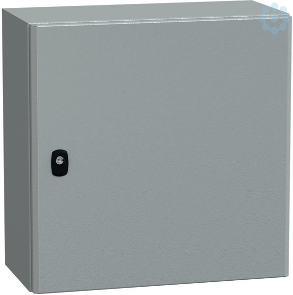 Wandschrank Spacial S3D aus Stahlblech mit Montageplatte. 500 x 500 x 250 mm. Korpus aus einem Stück gefalzt und verschweißt, verstärktes Vorderprofil in zweifacher Blechstärke als Regenrinnenprofil. Bündige Rückseite. IP66, IK10. Leicht aushängbare Tür, schneller Türanschlagwechsel, hervorragende Stabilität durch 20 mm starken Verstärkungsrahmen in doppelter Blechstärke, Türöffnung 120°, 2 oder 3 verdeckt liegende Scharniere. Dreipunktverschlusssystem mit nur einem Betätigungselement ab Bauhöhe 600 mm. Problemloser Gestängeumbau. Max. Belastbarkeit: 50 kg/m2. angefastes Türprofil, plasmaverschweißt, Beschichtung aus Epoxy-Polyester in RAL 7035.