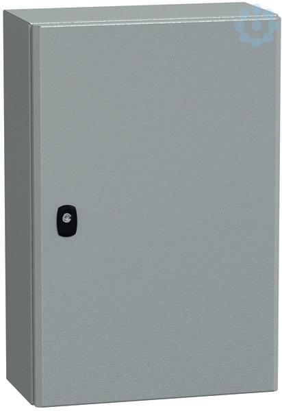 Wandschrank Spacial S3D aus Stahlblech mit Montageplatte. 600 x 400 x 200 mm. Korpus aus einem Stück gefalzt und verschweißt, verstärktes Vorderprofil in zweifacher Blechstärke als Regenrinnenprofil. Bündige Rückseite. IP66, IK10. Leicht aushängbare Tür, schneller Türanschlagwechsel, hervorragende Stabilität durch 20 mm starken Verstärkungsrahmen in doppelter Blechstärke, Türöffnung 120°, 2 oder 3 verdeckt liegende Scharniere. Dreipunktverschlusssystem mit nur einem Betätigungselement ab Bauhöhe 600 mm. Problemloser Gestängeumbau. Max. Belastbarkeit: 50 kg/m2. angefastes Türprofil, plasmaverschweißt, Beschichtung aus Epoxy-Polyester in RAL 7035.