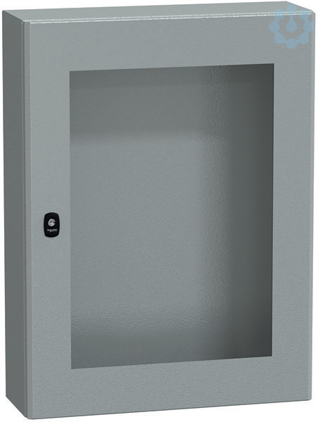 Spacial S3D Wandgehäuse aus Stahl mit Sichttür. 800 x 600 x 200 mm. Einteiliger Körper, ohne Montageplatte. 3-Punkt-Verschlusssystem mit Griff und 3 mm Doppelbartschliessung. Aus Stahl, Epoxid-Polyester-Pulverbeschichtung. Schutzart IP 66, IK08, Farbe RAL 7035. 1 Kabelverschraubungsplatte im Lieferumfang enthalten, Standard.