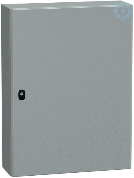 Wandschrank Spacial S3D aus Stahlblech mit Montageplatte. 800 x 600 x 200 mm. Korpus aus einem Stück gefalzt und verschweißt, verstärktes Vorderprofil in zweifacher Blechstärke als Regenrinnenprofil. Bündige Rückseite. IP66, IK10. Leicht aushängbare Tür, schneller Türanschlagwechsel, hervorragende Stabilität durch 20 mm starken Verstärkungsrahmen in doppelter Blechstärke, Türöffnung 120°, 2 oder 3 verdeckt liegende Scharniere. Dreipunktverschlusssystem mit nur einem Betätigungselement ab Bauhöhe 600 mm. Problemloser Gestängeumbau. Max. Belastbarkeit: 50 kg/m2. angefastes Türprofil, plasmaverschweißt, Beschichtung aus Epoxy-Polyester in RAL 7035.