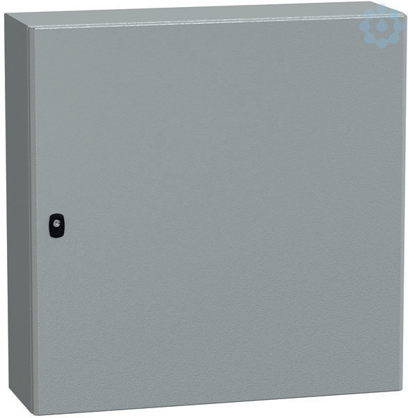 Wandschrank Spacial S3D aus Stahlblech mit Montageplatte. 800 x 800 x 250 mm. Korpus aus einem Stück gefalzt und verschweißt, verstärktes Vorderprofil in zweifacher Blechstärke als Regenrinnenprofil. Bündige Rückseite. IP66, IK10. Leicht aushängbare Tür, schneller Türanschlagwechsel, hervorragende Stabilität durch 20 mm starken Verstärkungsrahmen in doppelter Blechstärke, Türöffnung 120°, 2 oder 3 verdeckt liegende Scharniere. Dreipunktverschlusssystem mit nur einem Betätigungselement ab Bauhöhe 600 mm. Problemloser Gestängeumbau. Max. Belastbarkeit: 50 kg/m2. angefastes Türprofil, plasmaverschweißt, Beschichtung aus Epoxy-Polyester in RAL 7035.